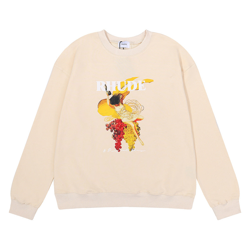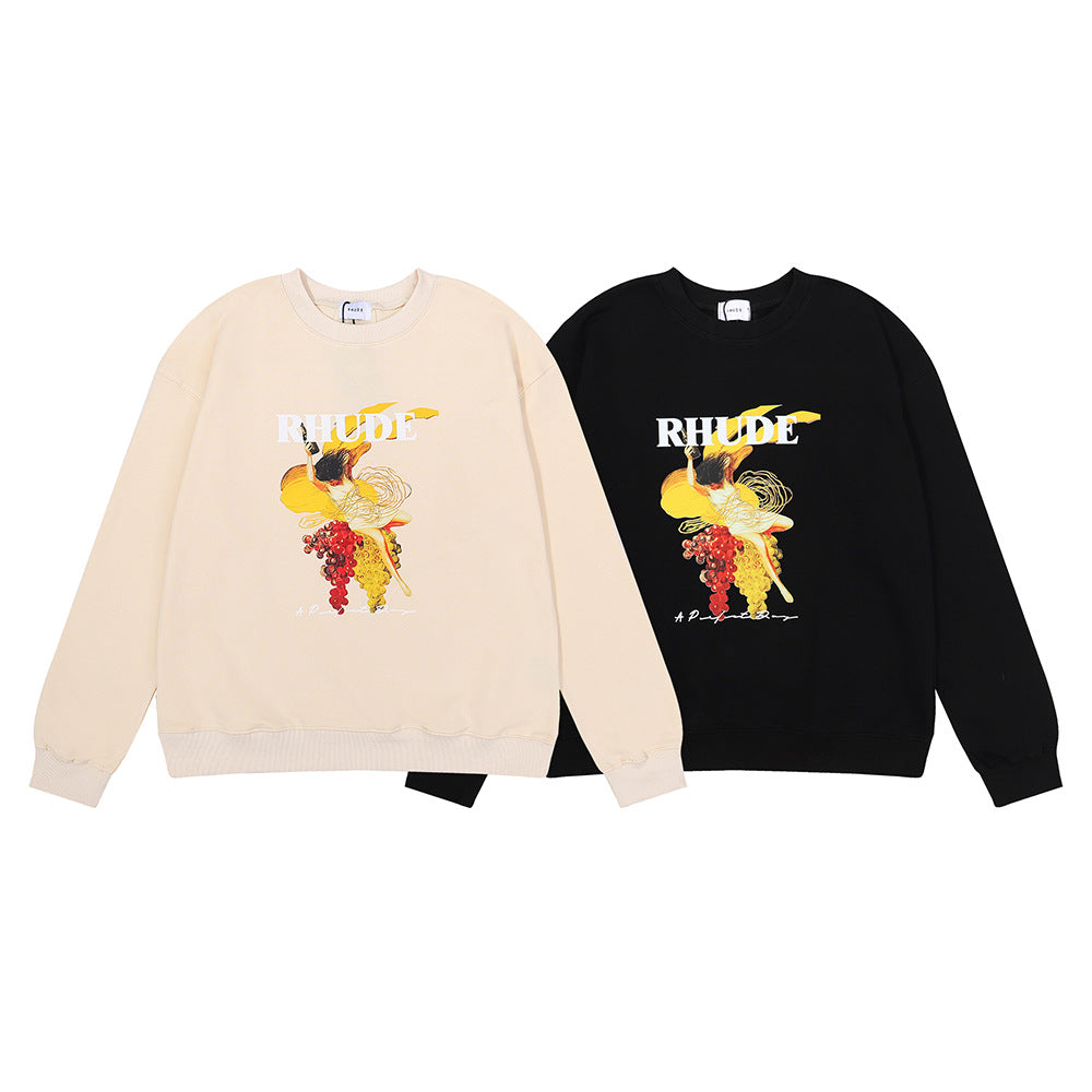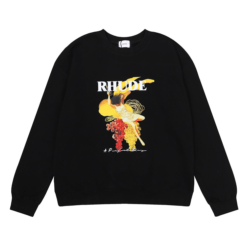 Rhude Hoodie Printed Cotton Terry Hip Hop Men and Women Casual round Neck Sweater