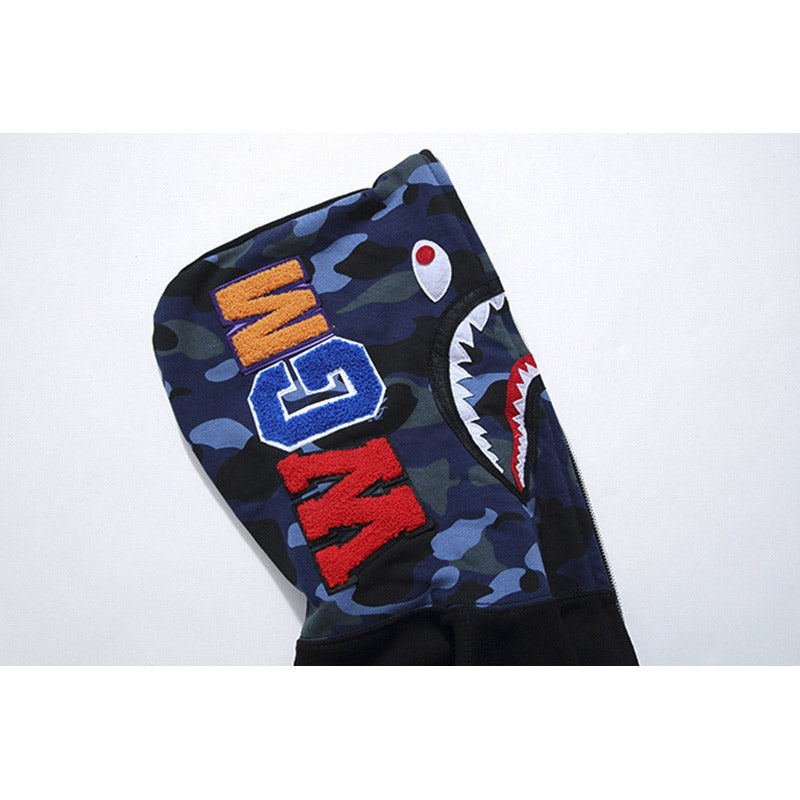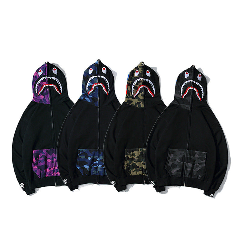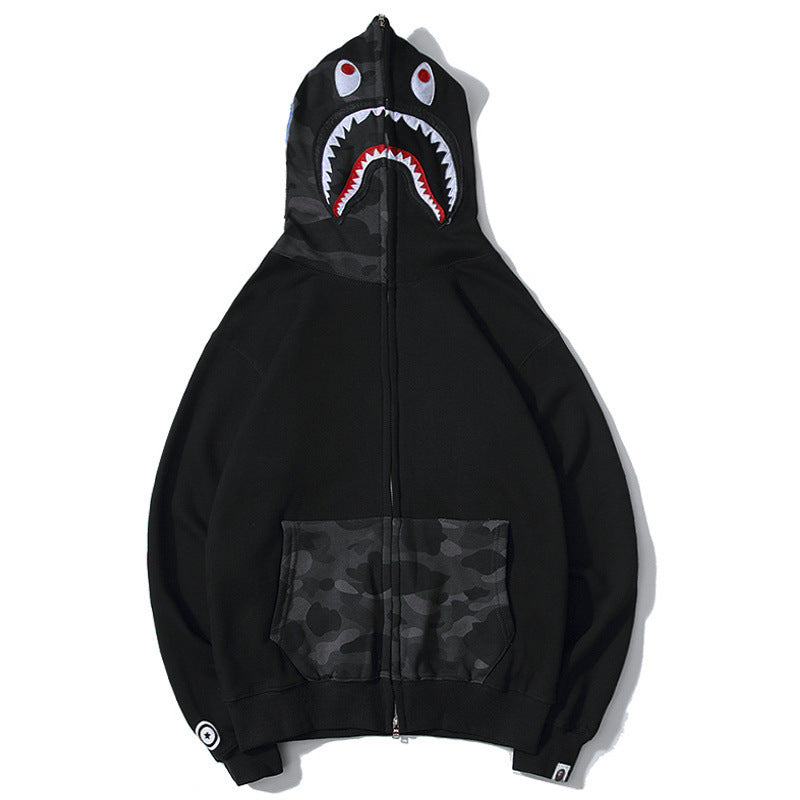 Shark Print Hoodie Autumn And Winter Stitching Pocket Zipper Fleece Padded Coat Men And Women Couple
