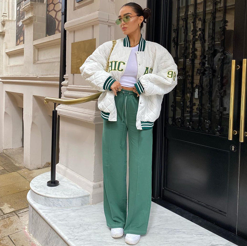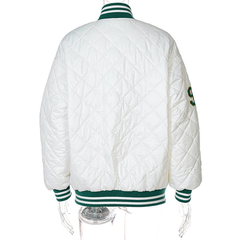 White Cropped Varsity Jacket Embroidered Retro Style Baseball Uniform Contrast Color Cotton-Padded Coat