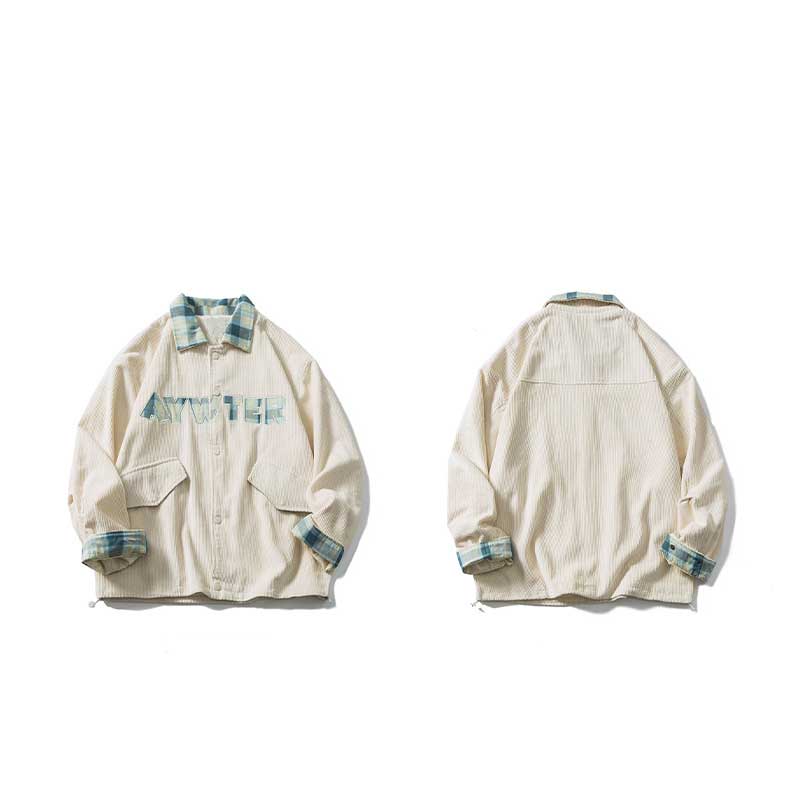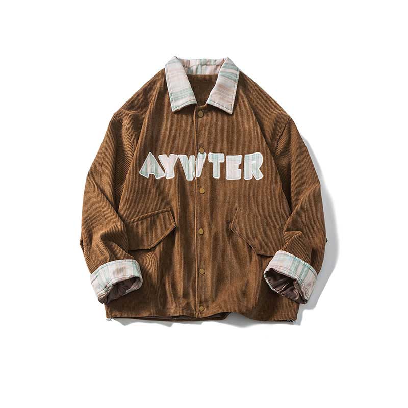 Brown Varsity Jacket Spring and Autumn Vintage Corduroy Polo Collar Jacket Men's Loose Plaid Stitching Embroidered Coat