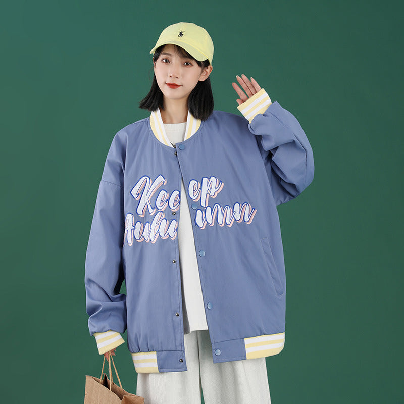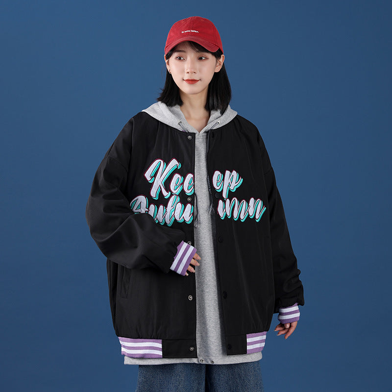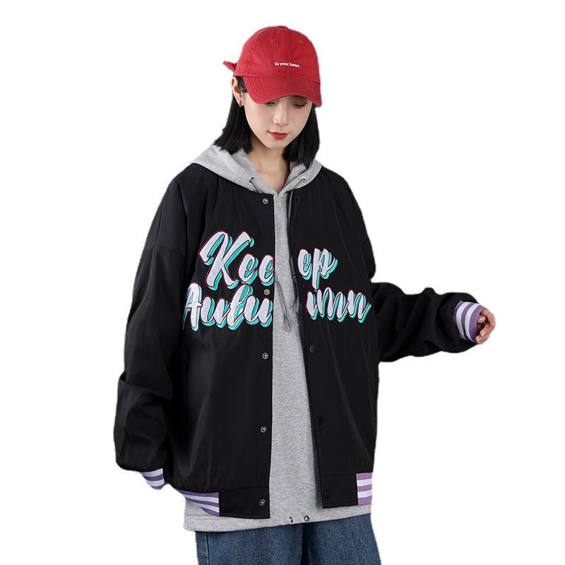 Black Varsity Jacket Autumn Letter Embroidered Stand Collar Woven Cotton Loose Men's and Women's Baseball Uniform Women's Clothing Coat Jacket
