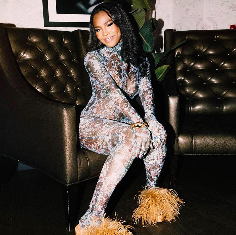 Autumn Hollow-out Gloves Sheer Long Sleeve round Stand Collar Sexy Mesh Jumpsuit