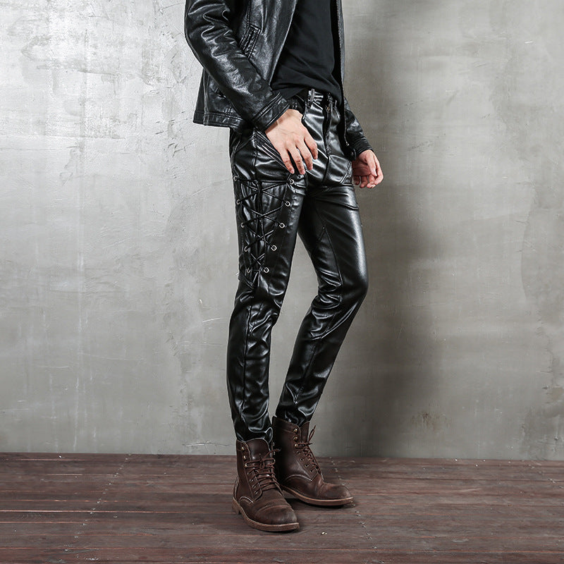 Mens Leather Pants Motorcycle Teenagers Men Leather Pants PU Leather Punk Leather Rope Tights Men Leather Pants