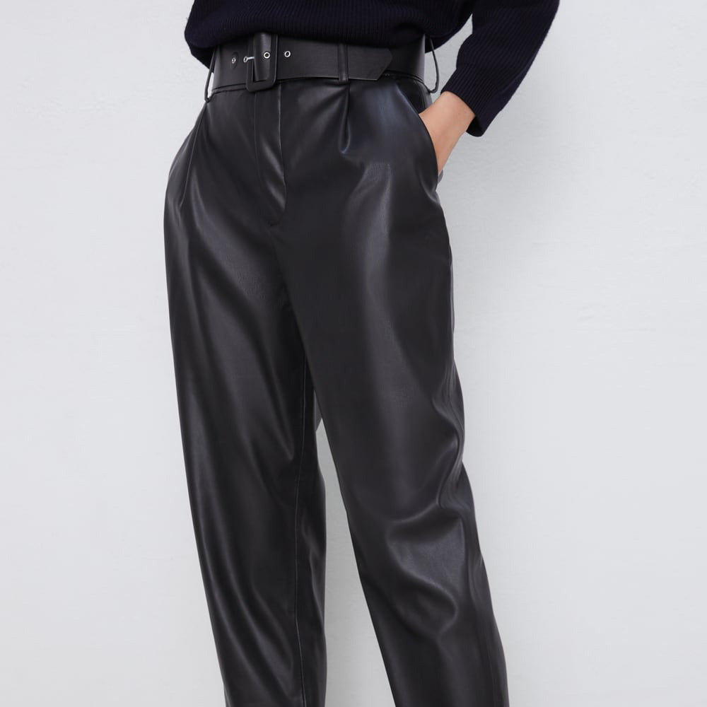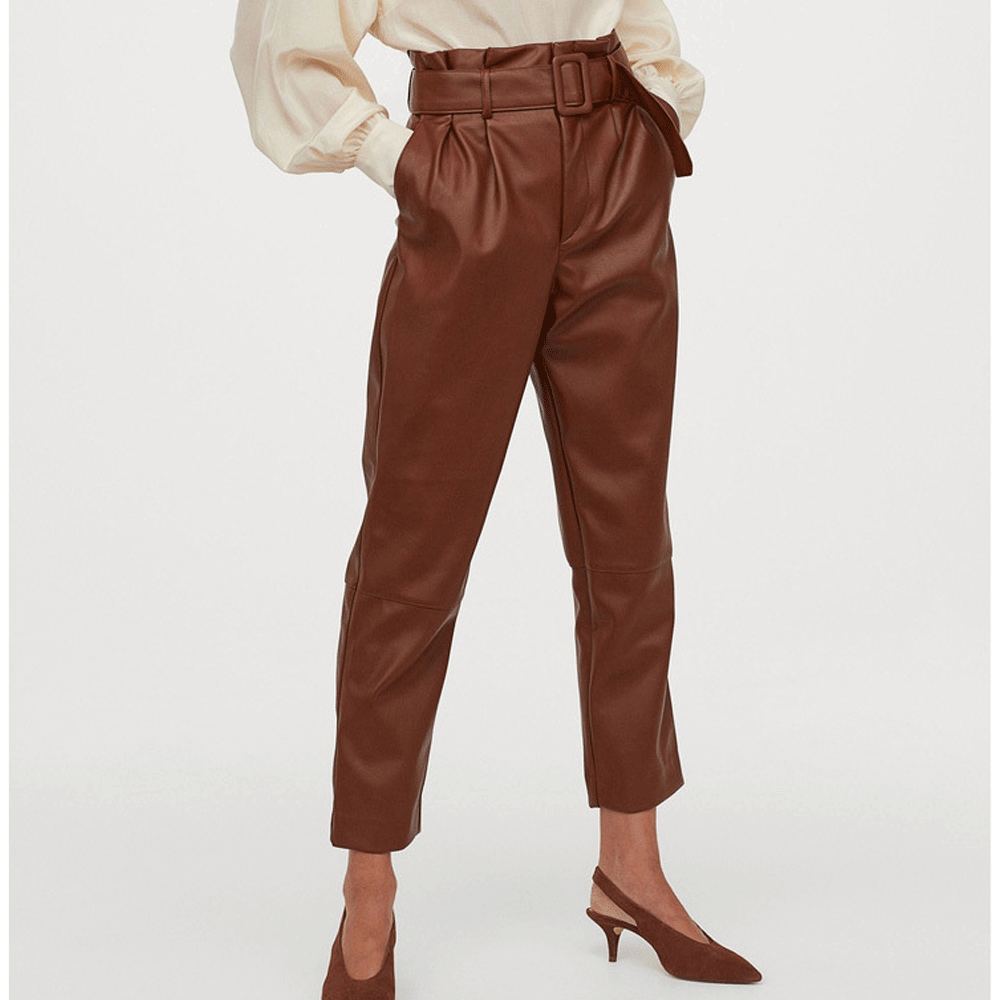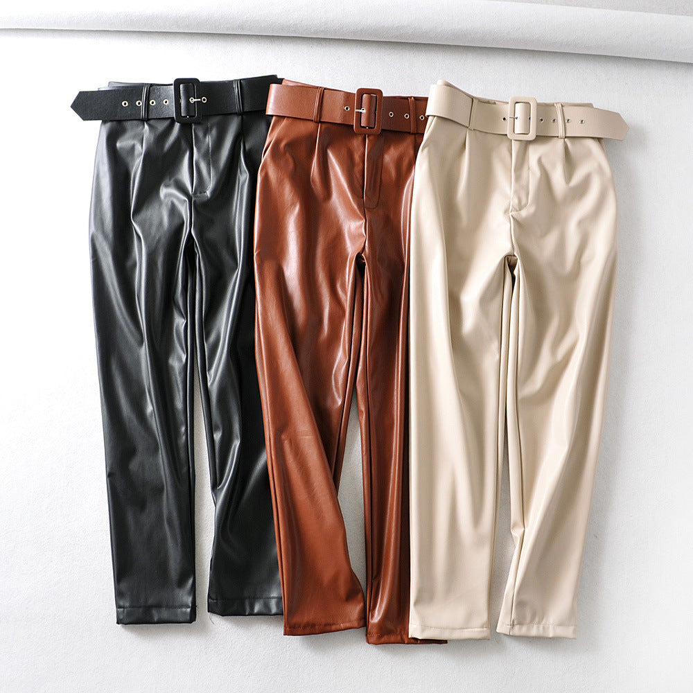 Brown Leather Pants Spring Wide Belt Leather Pants Women'S Washed Pu Leather Trousers Women