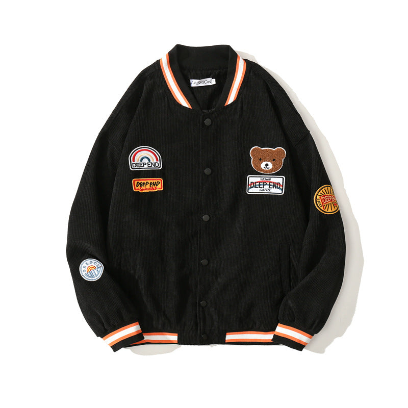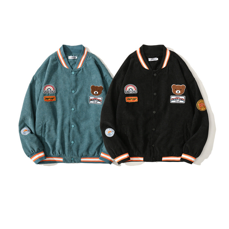 Baby Blue Varsity Jacket Retro Bear Embroidery Baseball Uniform Loose Casual Jacket